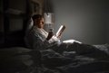 Archivo – Hombre leyendo un libro en la cama con una copa de vino.